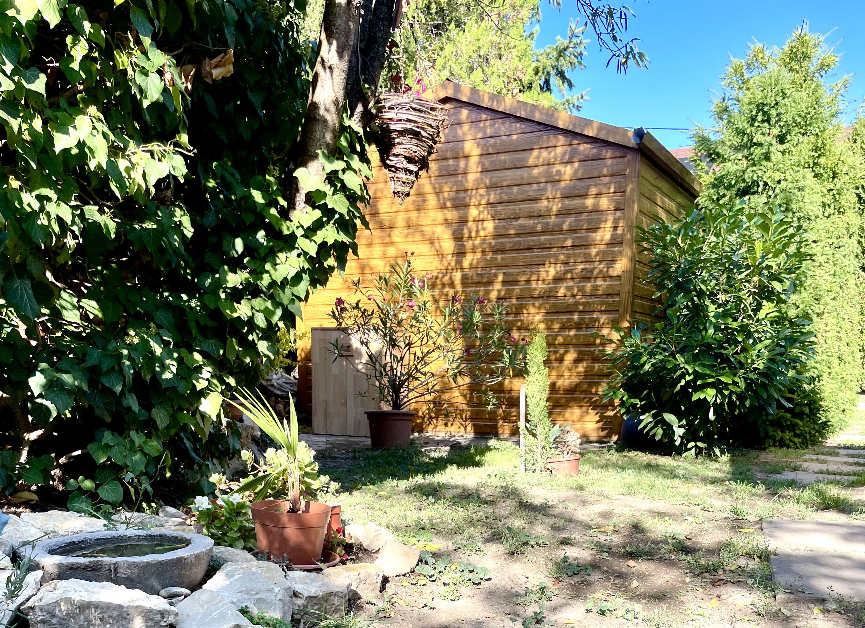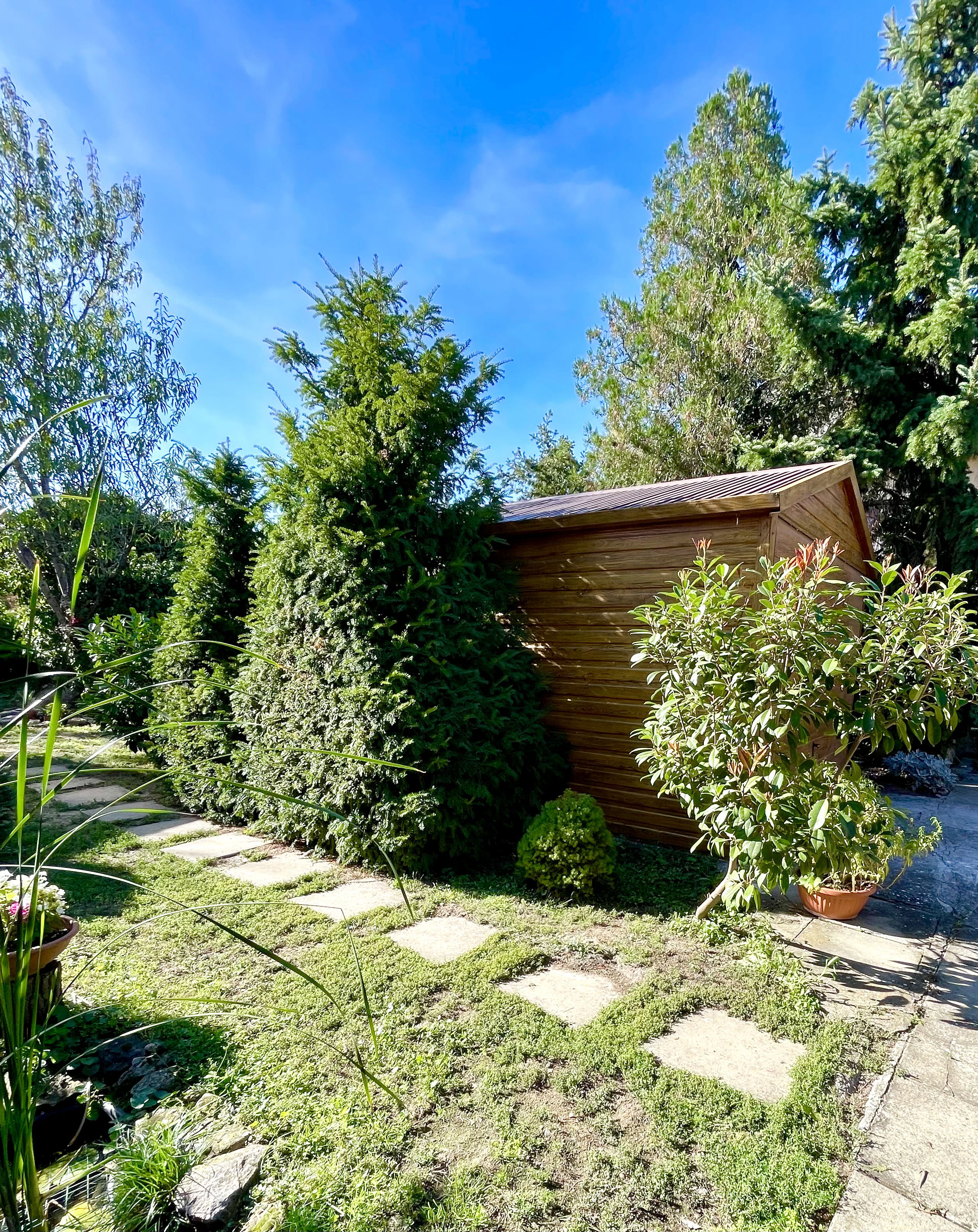 A szépen gondozott, körbekerített kertben díszfák, bokrok és gyümölcsfák találhatók, ideális pihenésre és kertészkedésre.