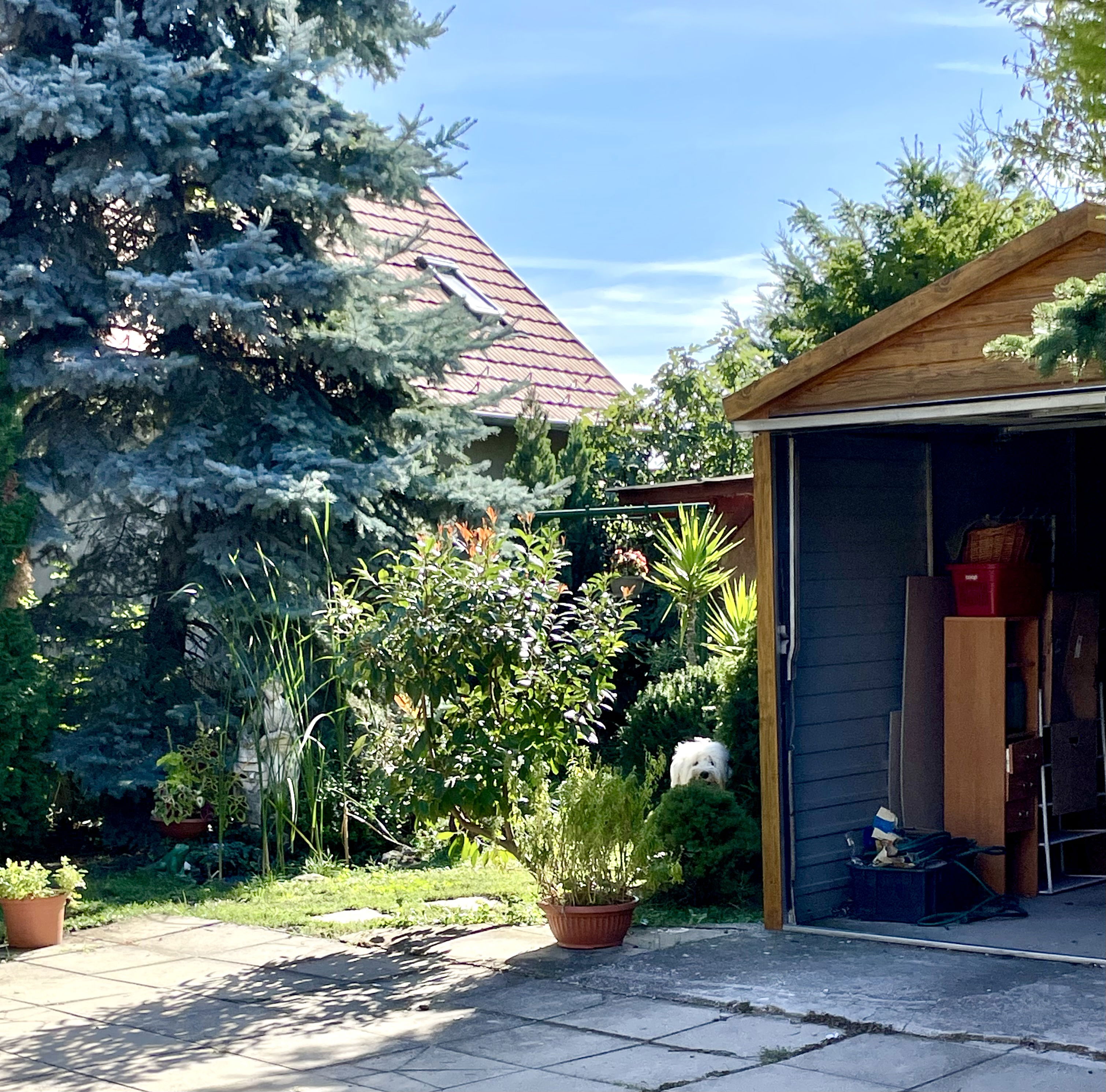 Saját, 16 nm-es garázs a telken, de a ház előtt az utcán, illetve az udvarban is lehet még parkolni.