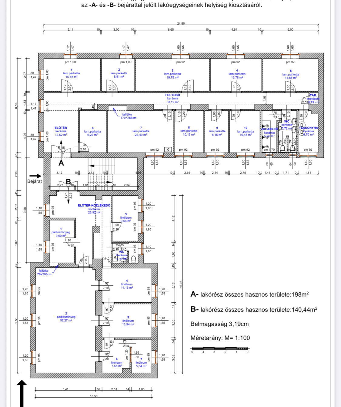 A "B" lakórész kisebb helyiségekből áll, minden helyiségben van fűtő-hűtő klíma, nagysága 140,44 nm.