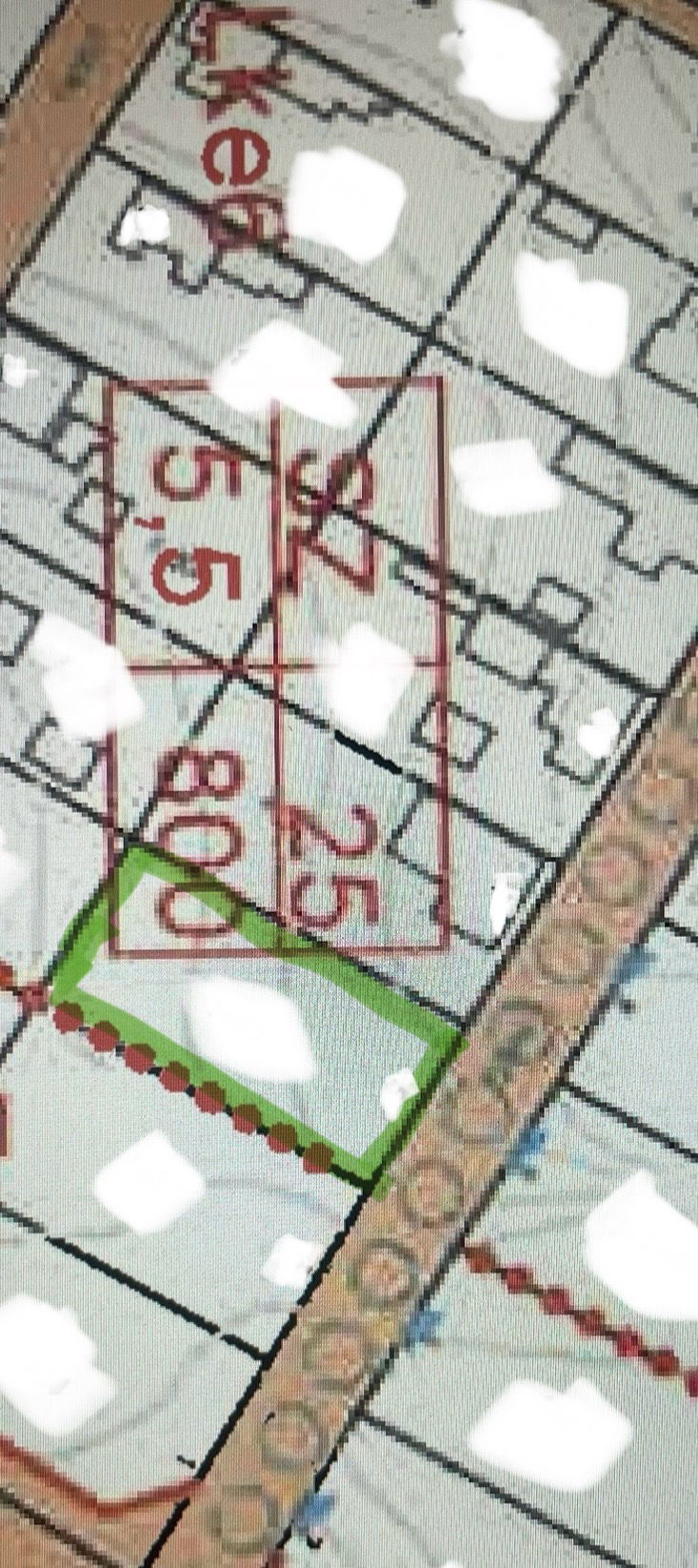 Térkép mellékleten zölddel körbekerített. A piros pontok a beépíthetőség határát jelzik, ami azt jelenti, hogy a telek alsó határa alatti telkekre építeni tilos.