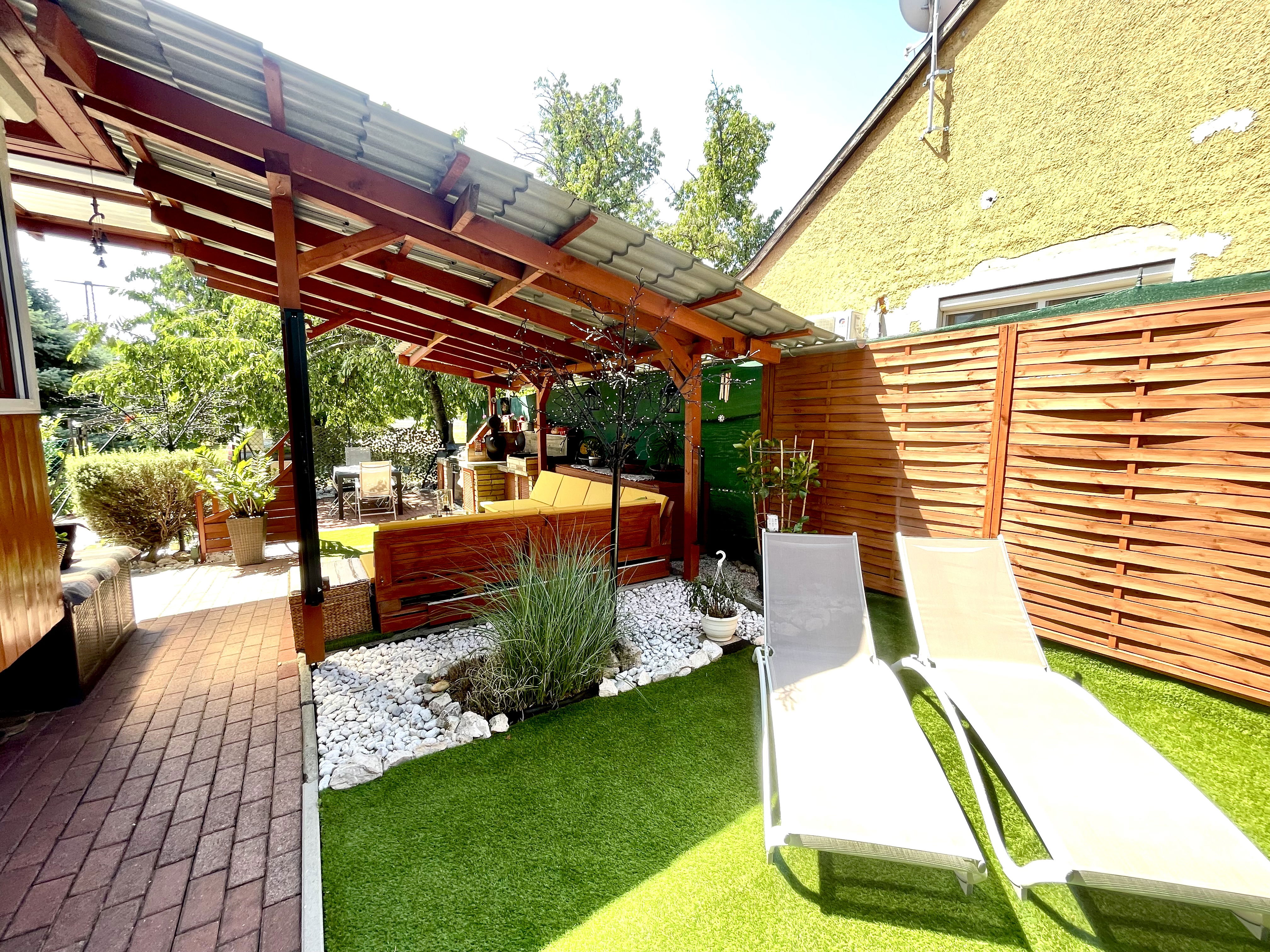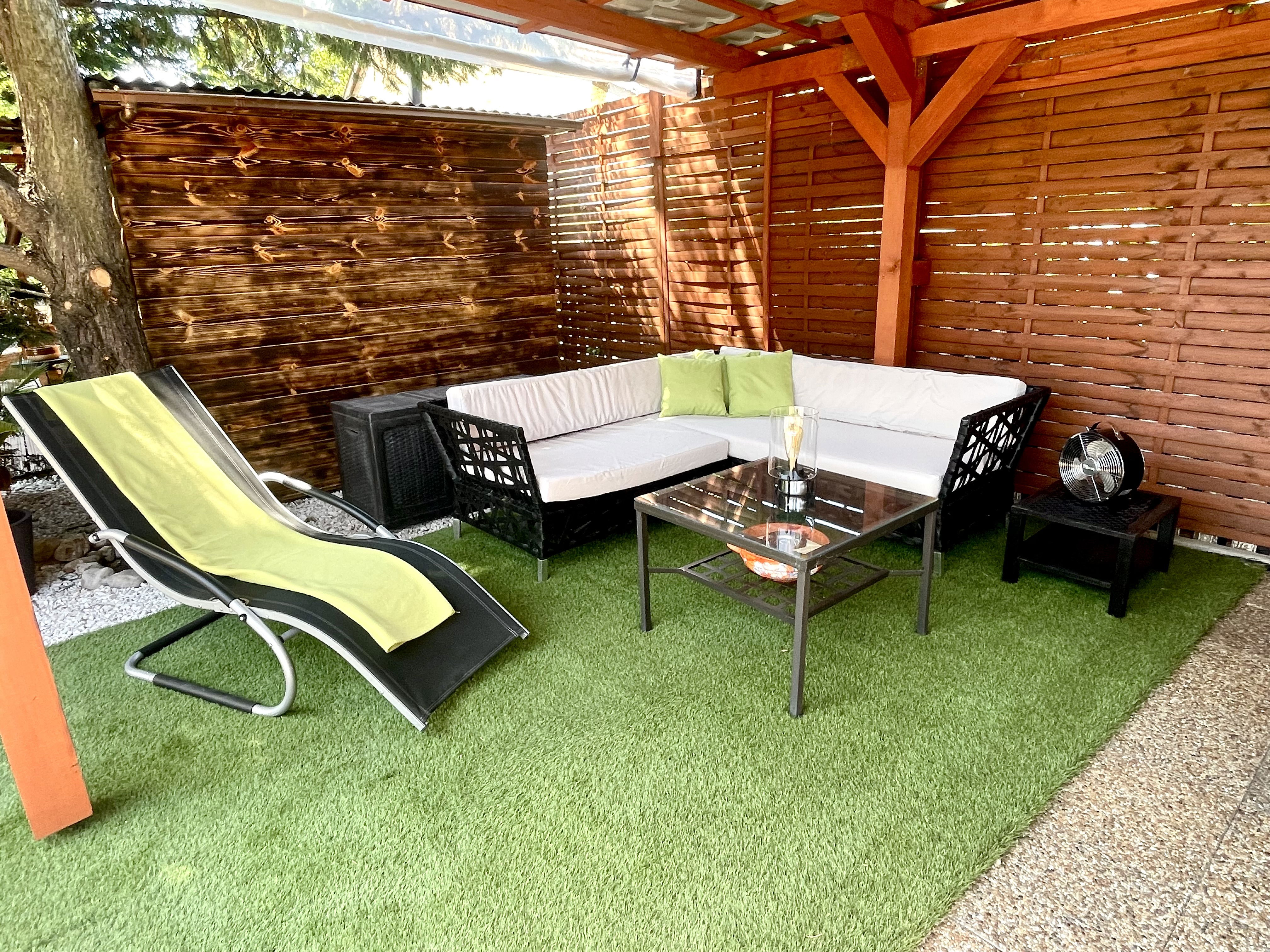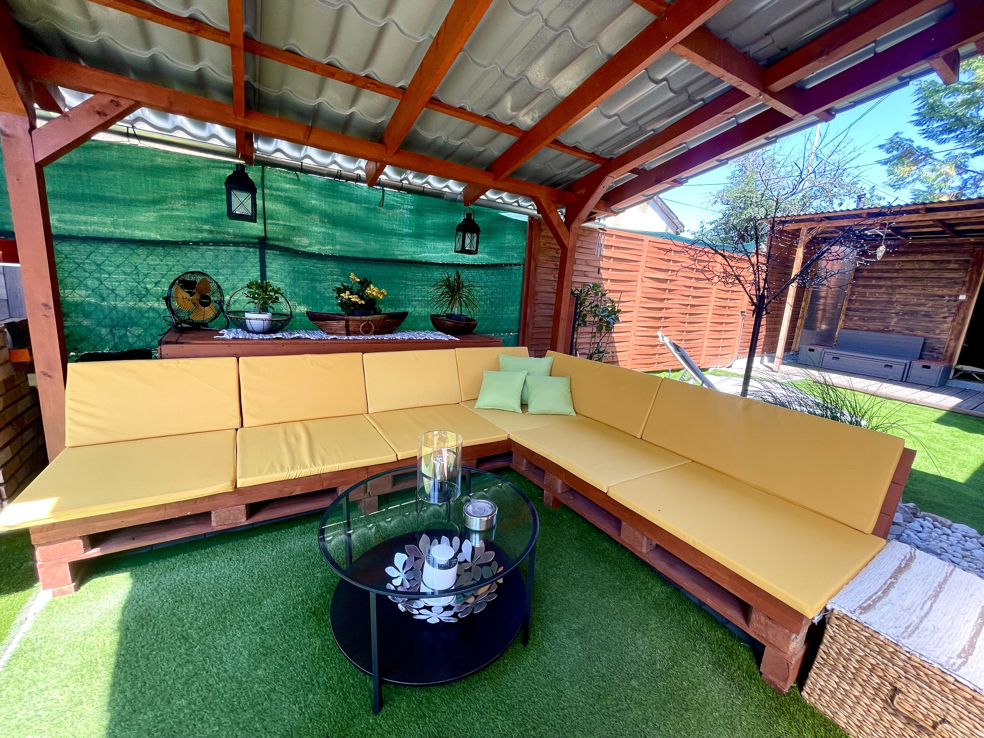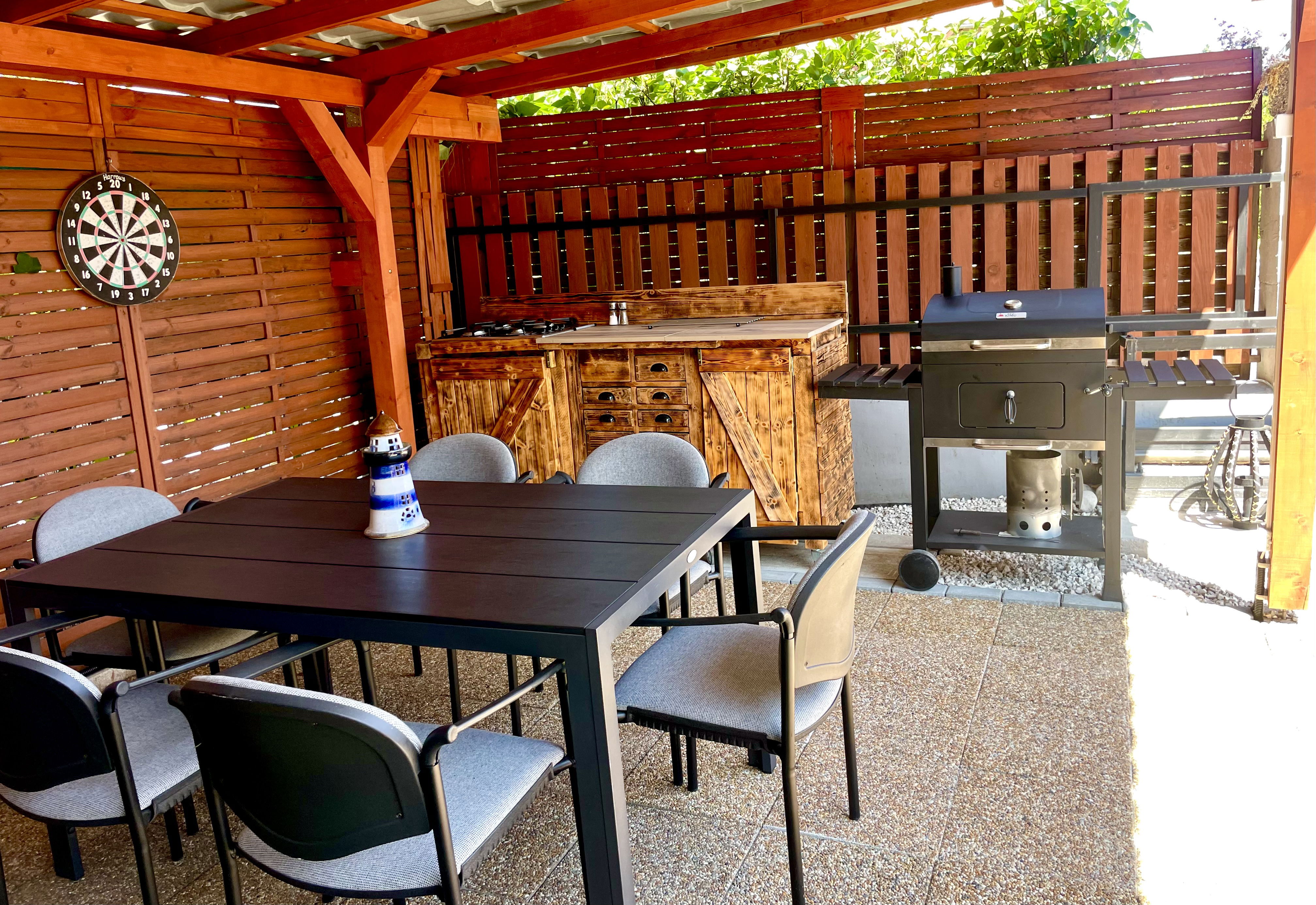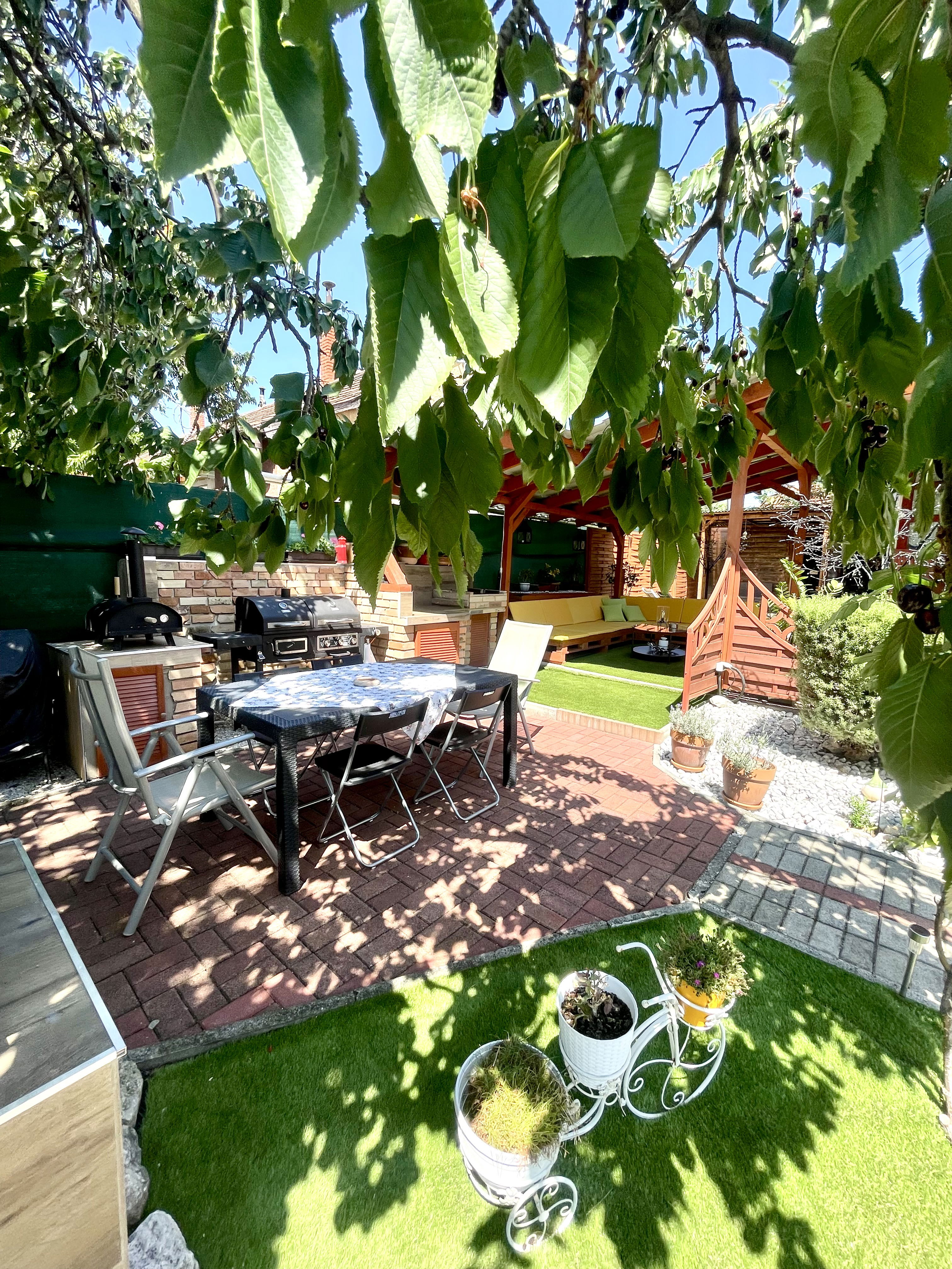 Balra a vendégek számára készített hatalmas grillterasz, jobbra a kerti kiülők és maga a 2021-ben épült apartmanház található.