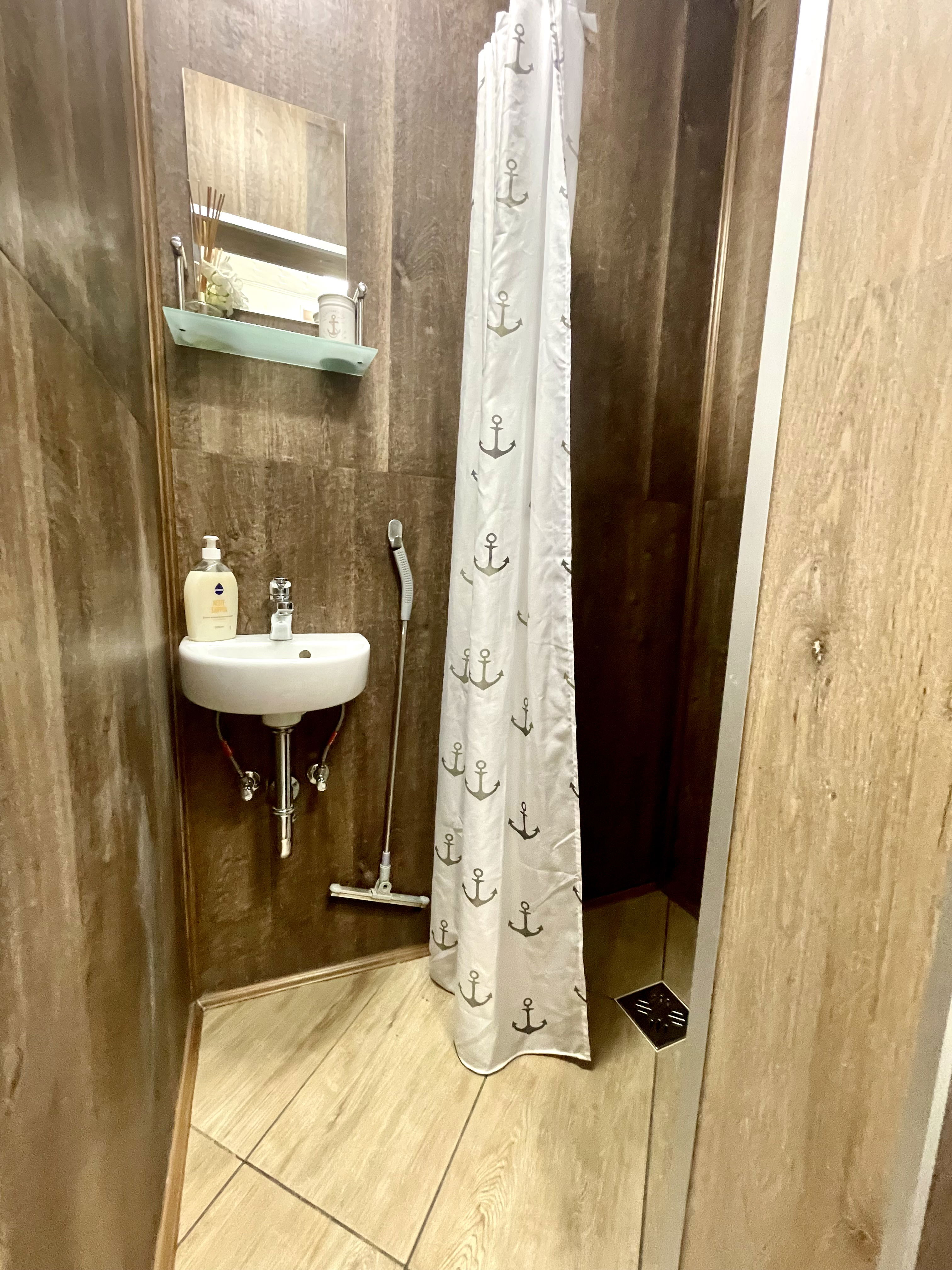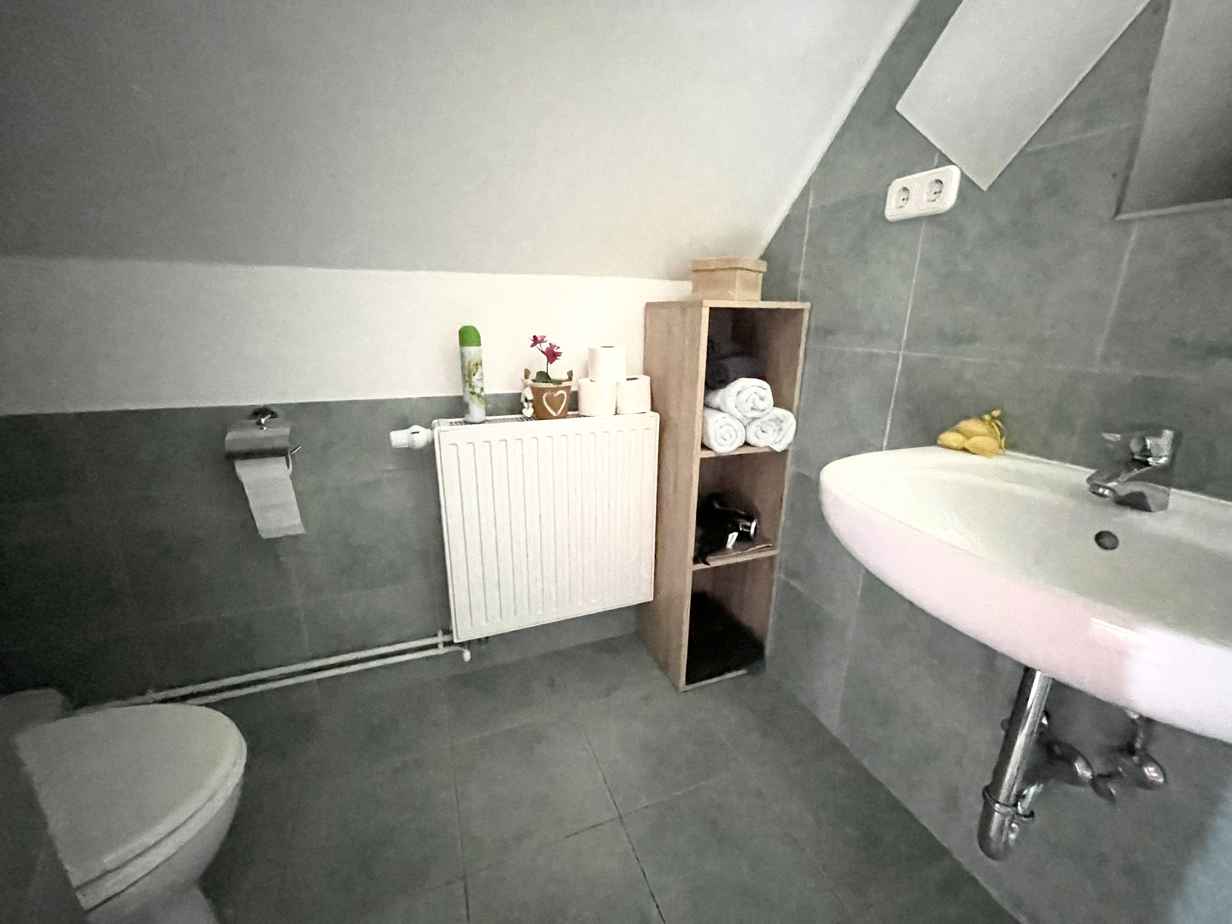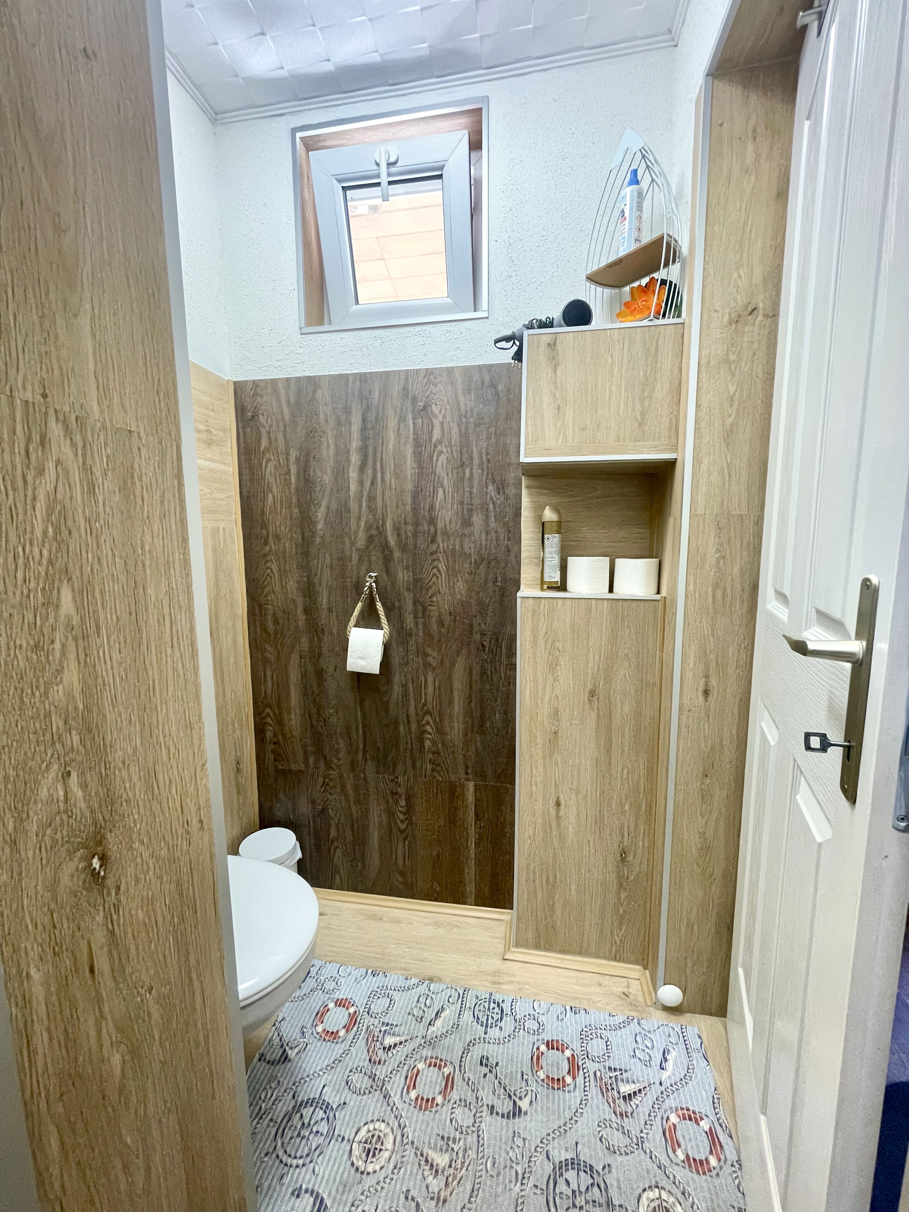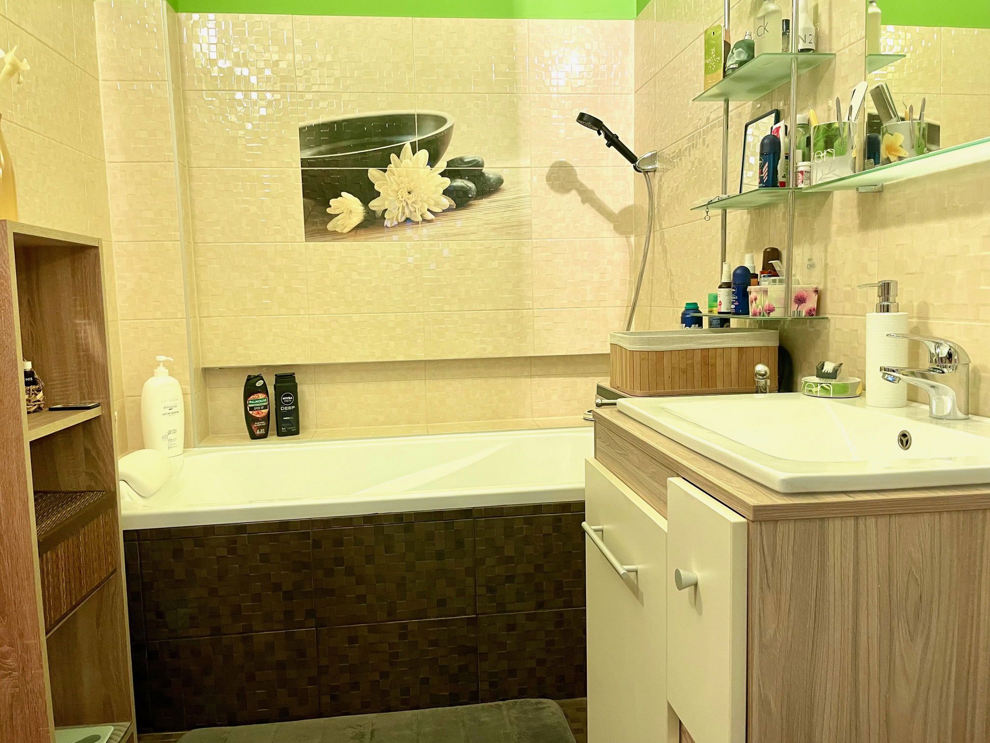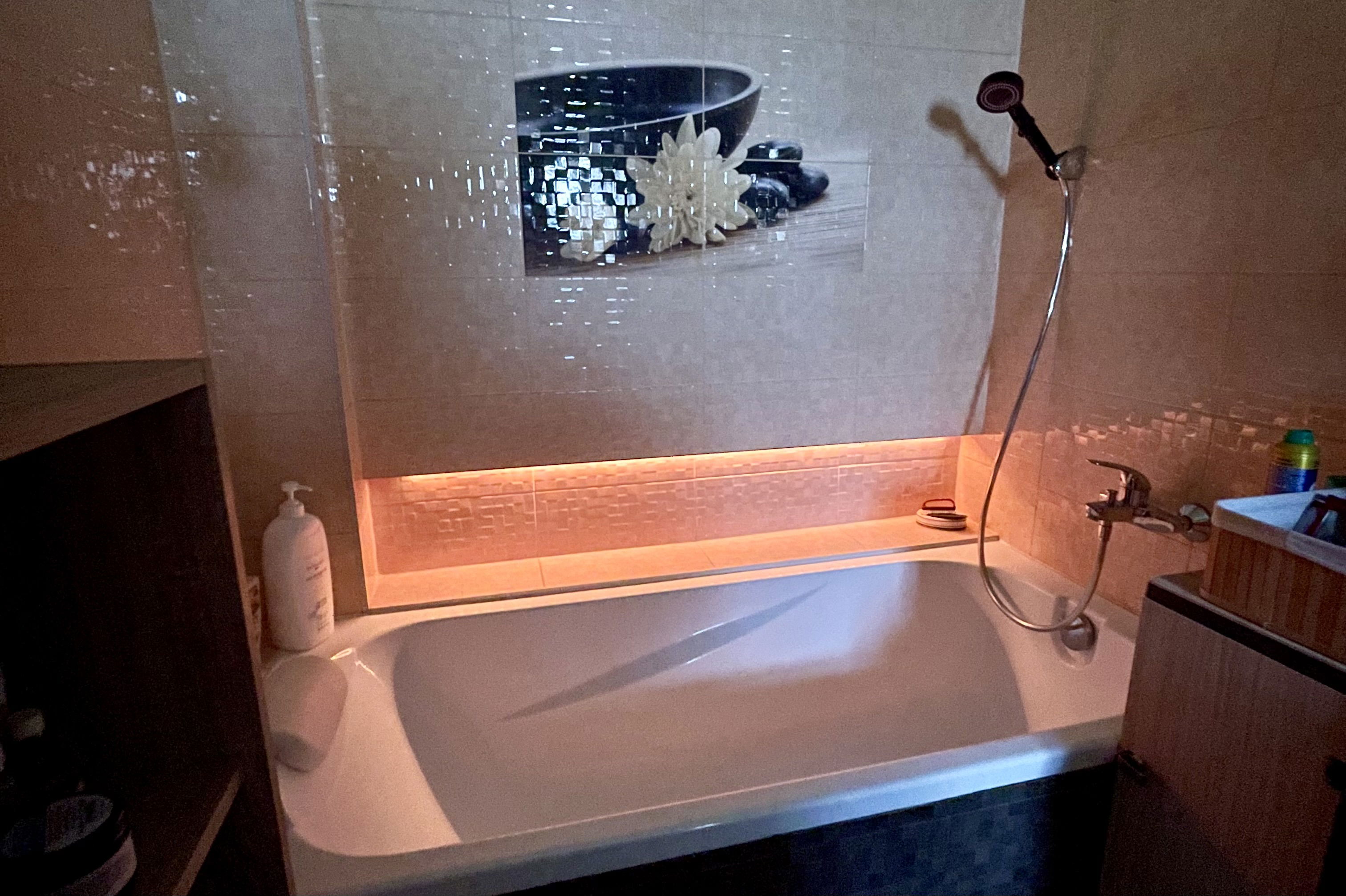 A lenti előszoba végén a gardróbszoba rejti el a ruhákat, cipőket. Az előszobából jobbra egy kisebb előtér fogad minket, ahonnan balra a nagyméretű, kádas fürdőszoba található.