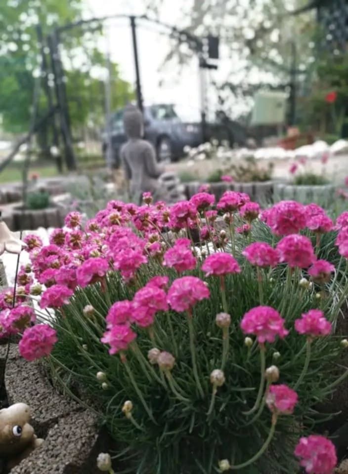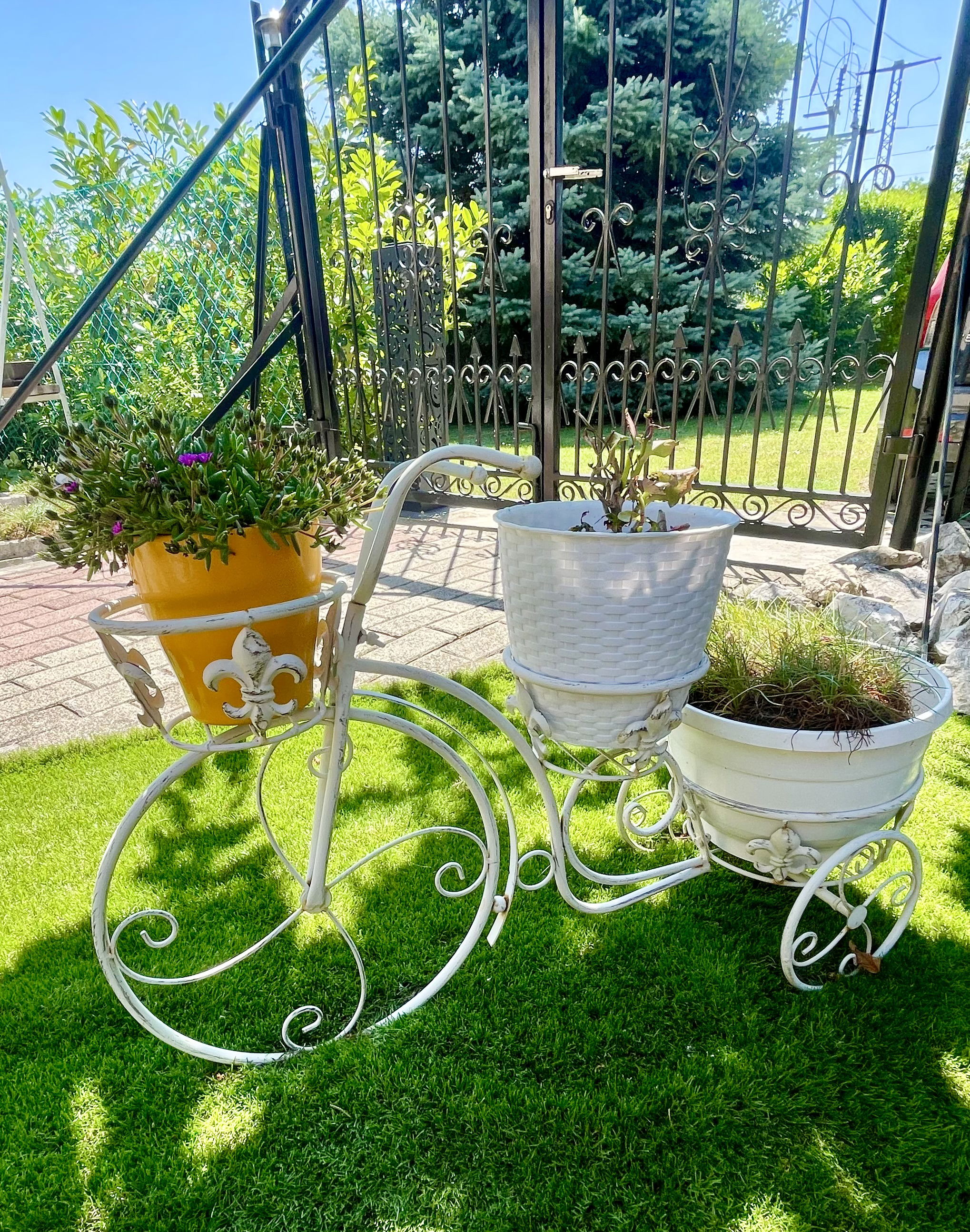 A kert rendezett, kellemes. Sok virág, zöld felület vesz minket körül, az öntözés a kerti kútról történik.