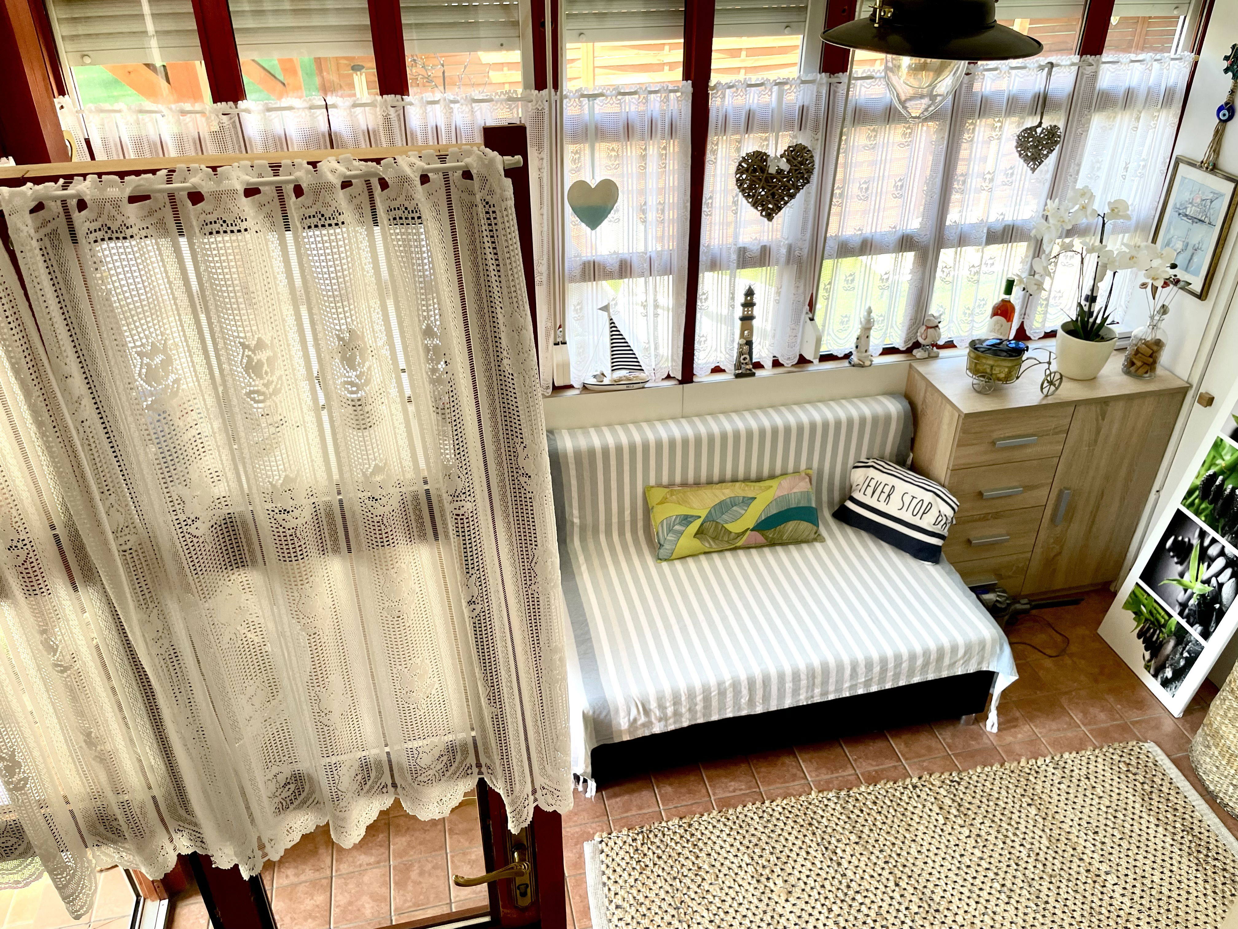 A téli hideg időkben a cserépkályha kínál alternatív fűtési lehetőséget, mely nem csak ezt a teret, hanem a hálószobát is fűti. A nappali és a hálószoba fala, az iker felé néző fal teljesen hangszigelt.