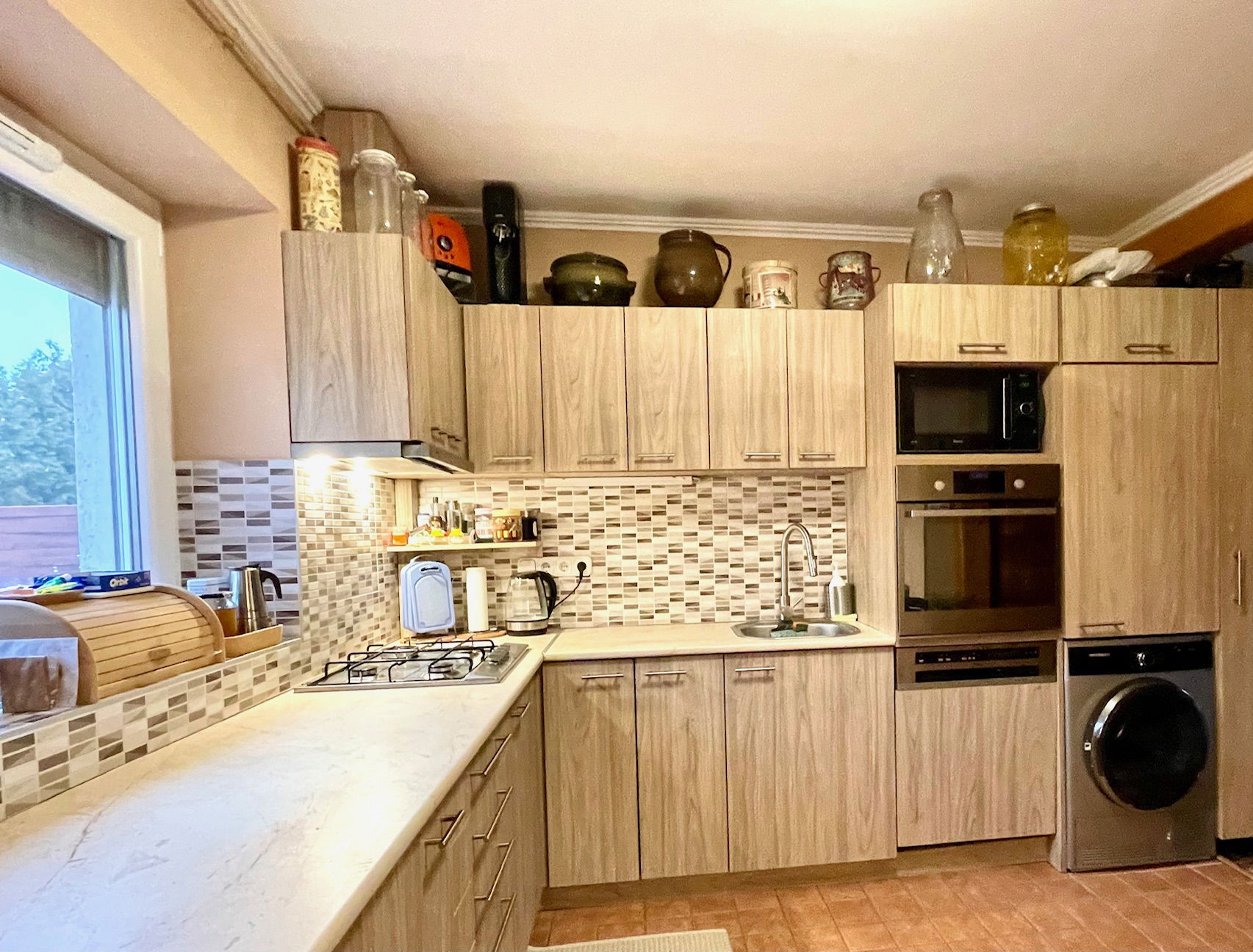 A kis előtérből egyenesen haladva tárul elénk a világos, tágas konyha-étkező- nappali.
