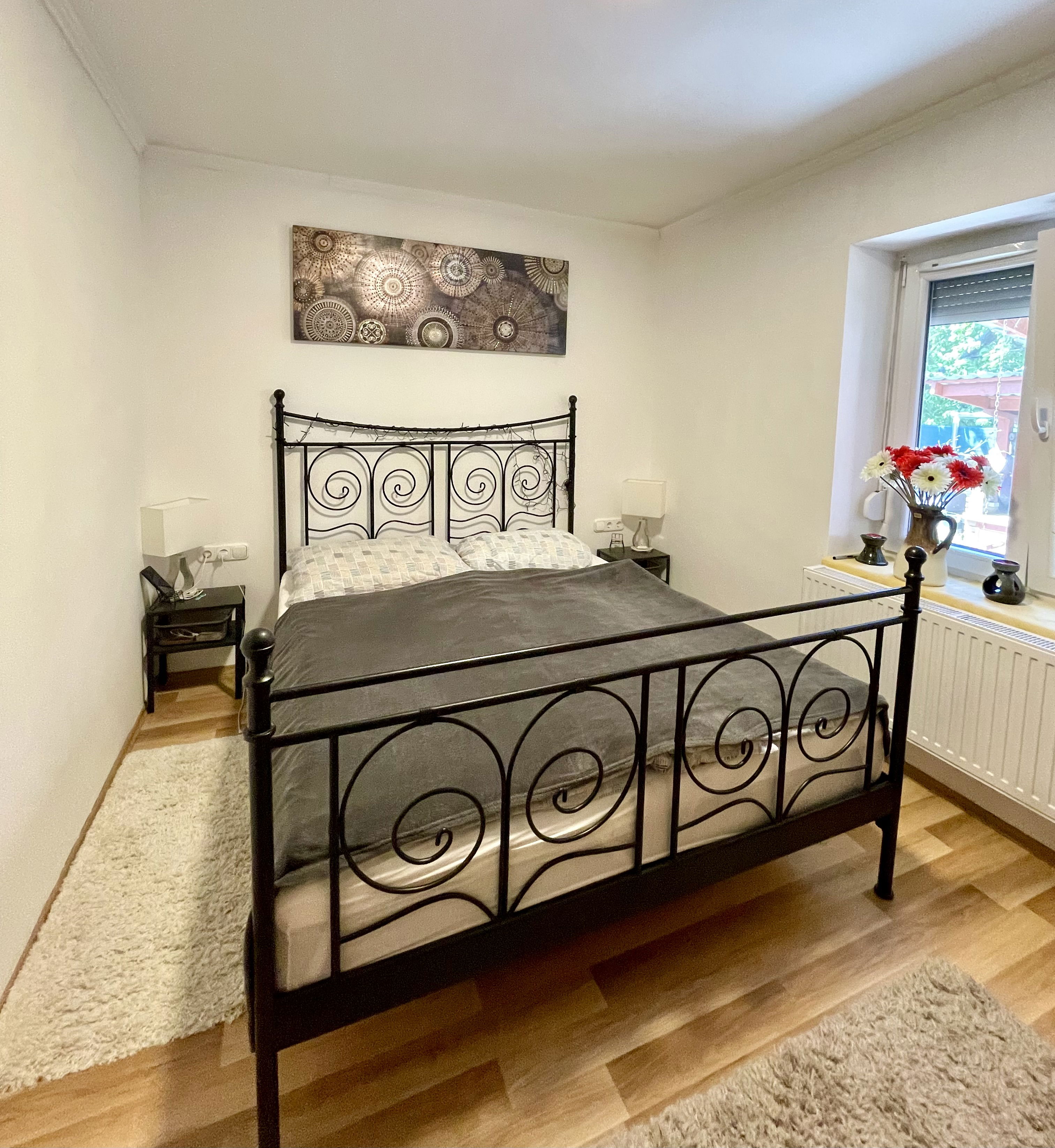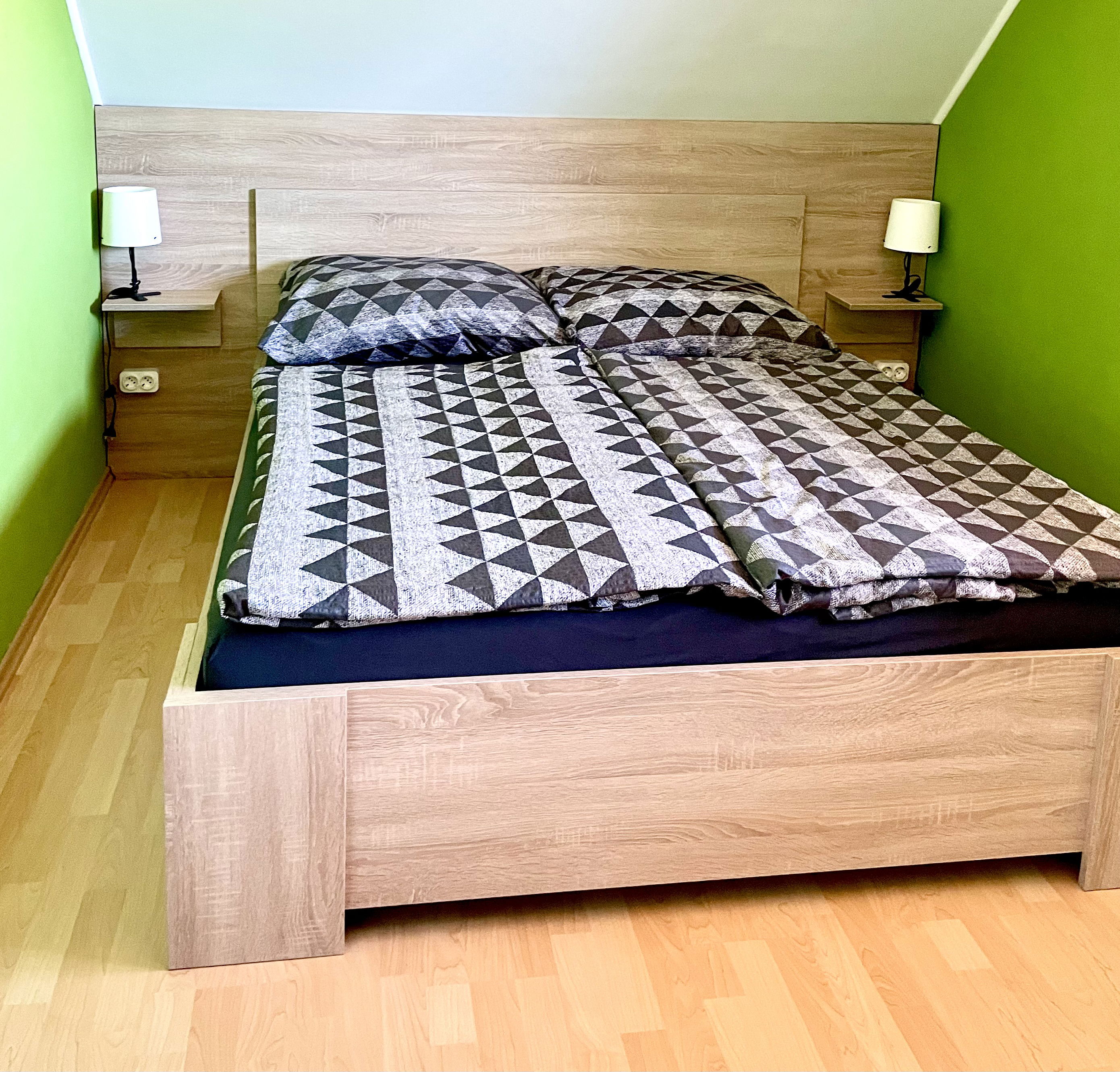 Az előtérből jobbra lezárásként található a kényelmes, tágas, kertre néző, világos hálószoba, egyedi szekrényekkel.