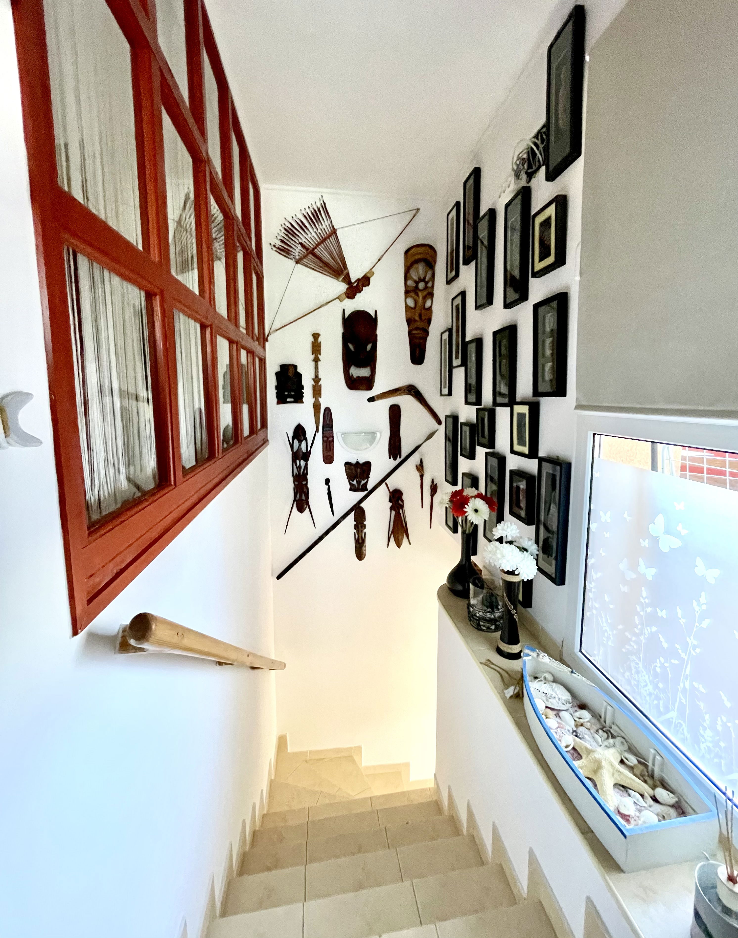 A gondozott kertből az előszobába jutunk, ahonnan jobbra indul a lépcső az emeletre, ahol egy teljes önálló apartmant alakított ki a tulajdonos.