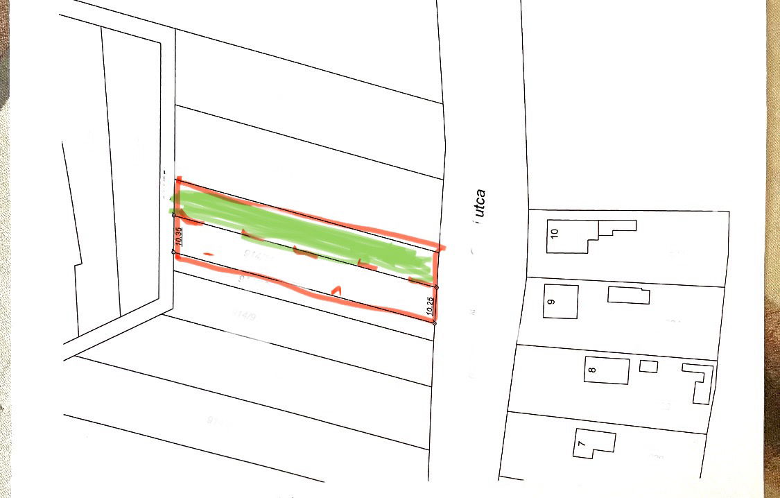 A meghirdetett terület két darab, egyenként 10, 25 m (utcafront) x 76,5 m (hossz) telekből áll, a telkek ára telkenként 20 M Ft.