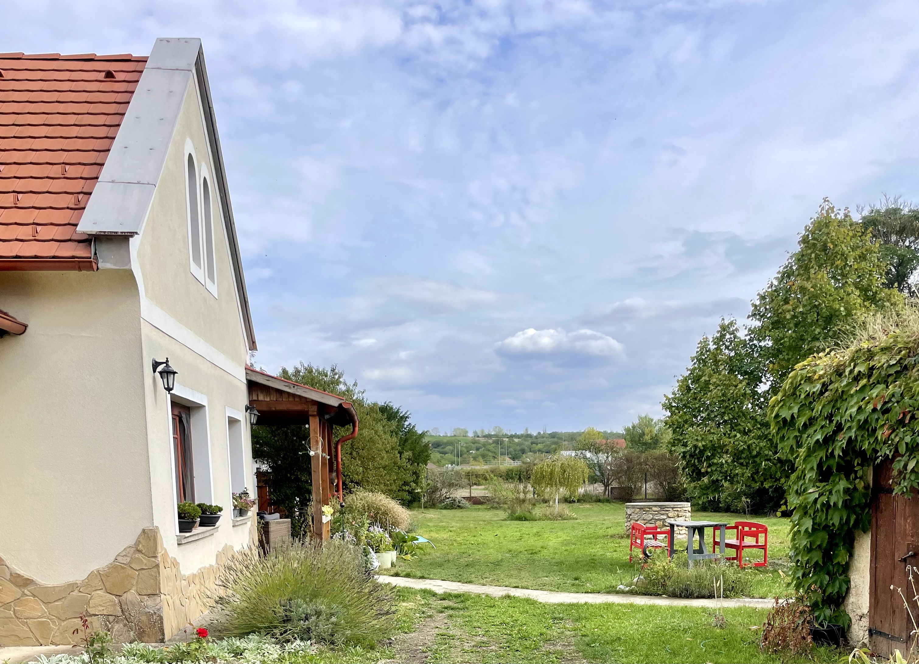 Az épületek elhelyezkedéséből adódóan nincsen belátás, kellemes, békés életérzés sugárzik a házból és a kertből. A hátsó, 5000 nm-es kertrész jelenleg művelésre ki van adva.