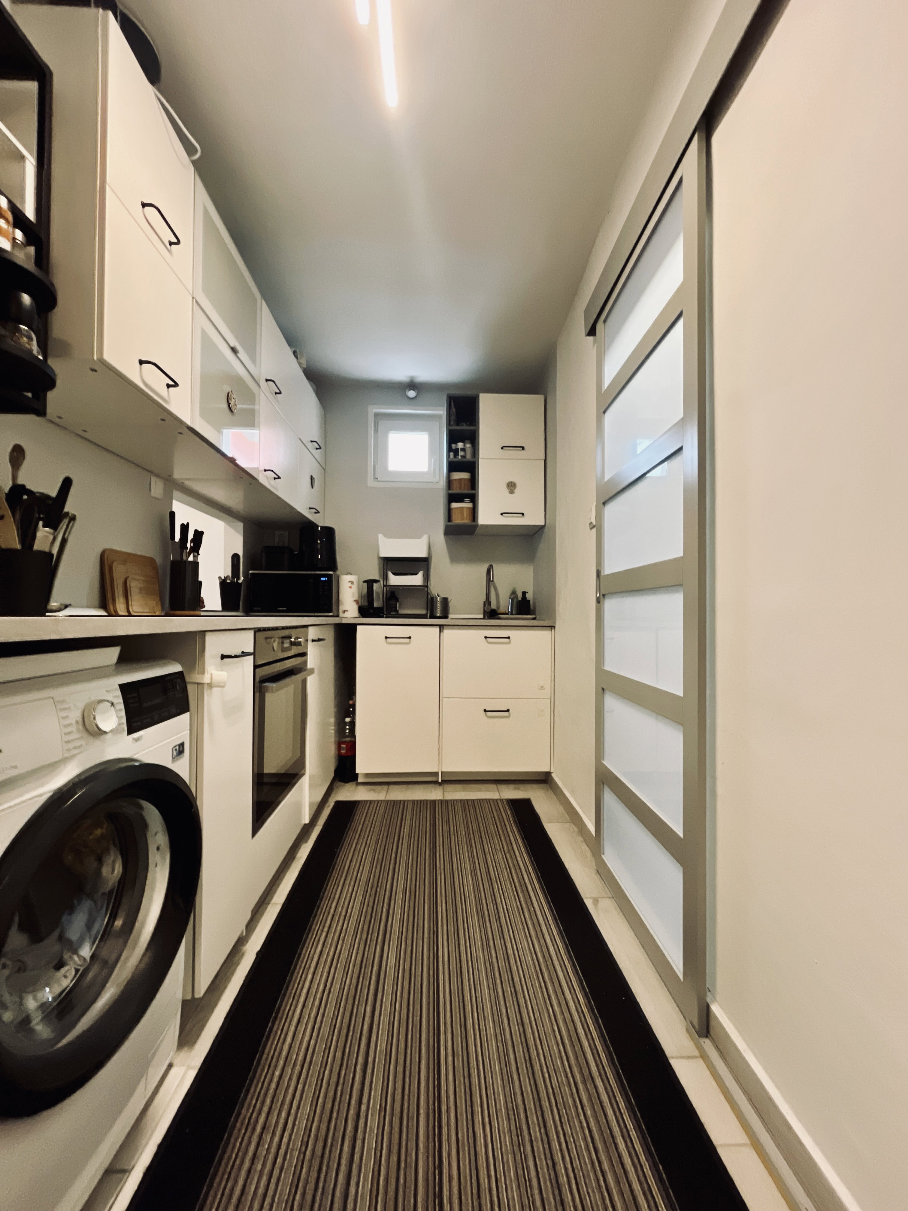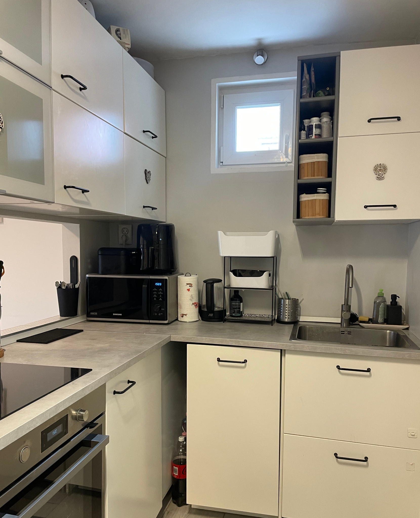 A konyha modern, letisztult és praktikus: 2023-ban teljesen megújult, jól átgondolt kialakítással, a mindennapi használatot szolgálva került kialakításra. Mérete: 5,5 m2, IKEA konyha beépítéssel, teljes gépesítéssel (mosogatógép, mosógép, elektromos sütő, elektromos főzőlap - mind a vételár része) modern megjelenéssel. A konyhai ablaknak köszönhetően jól szellőztethető, az átadóablak kialakításnak köszönhetően pedig sokkal praktikusabb a konyha-étkező kapcsolat.