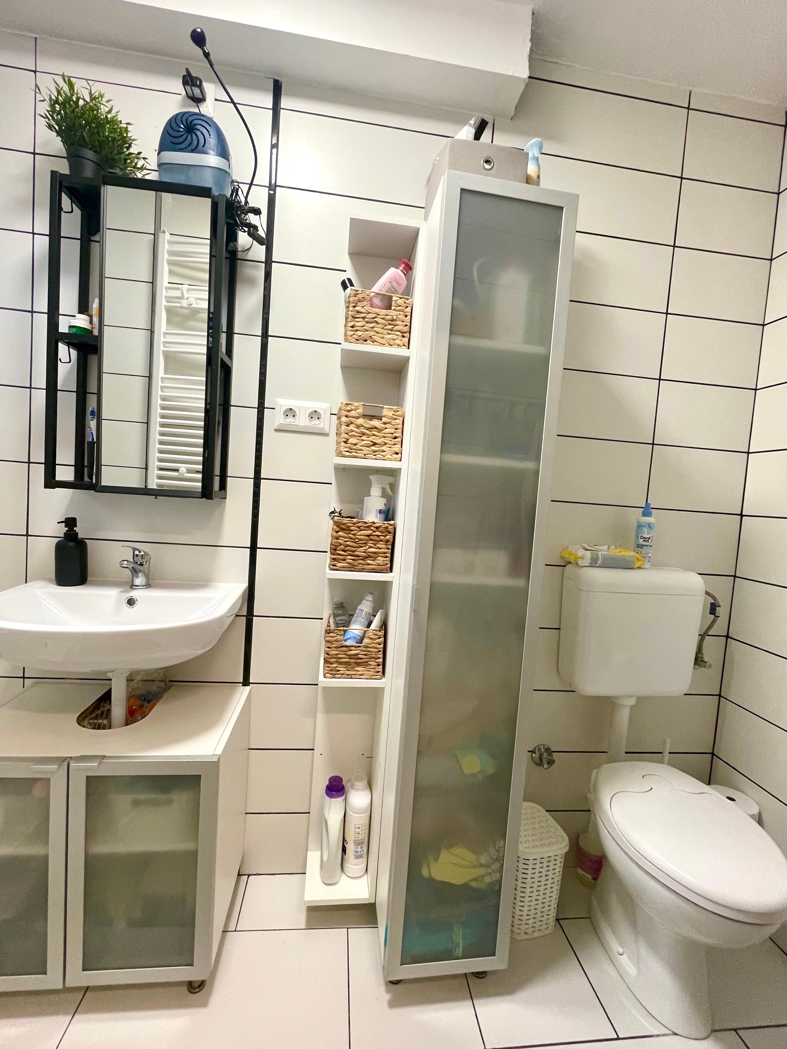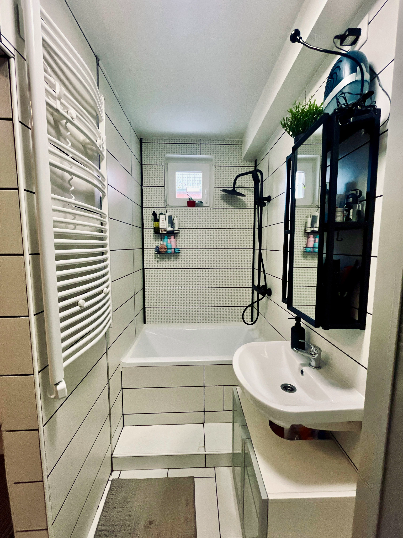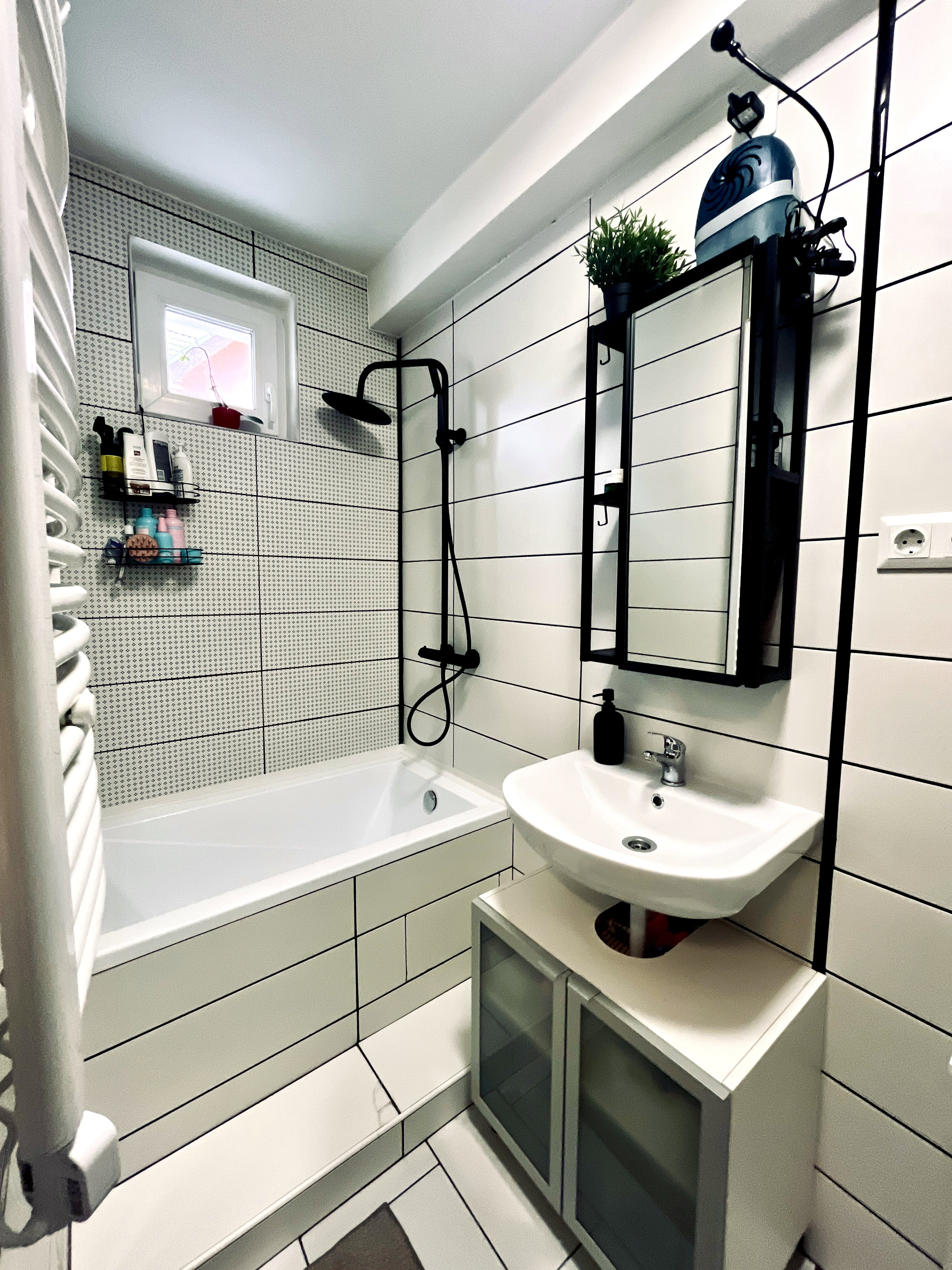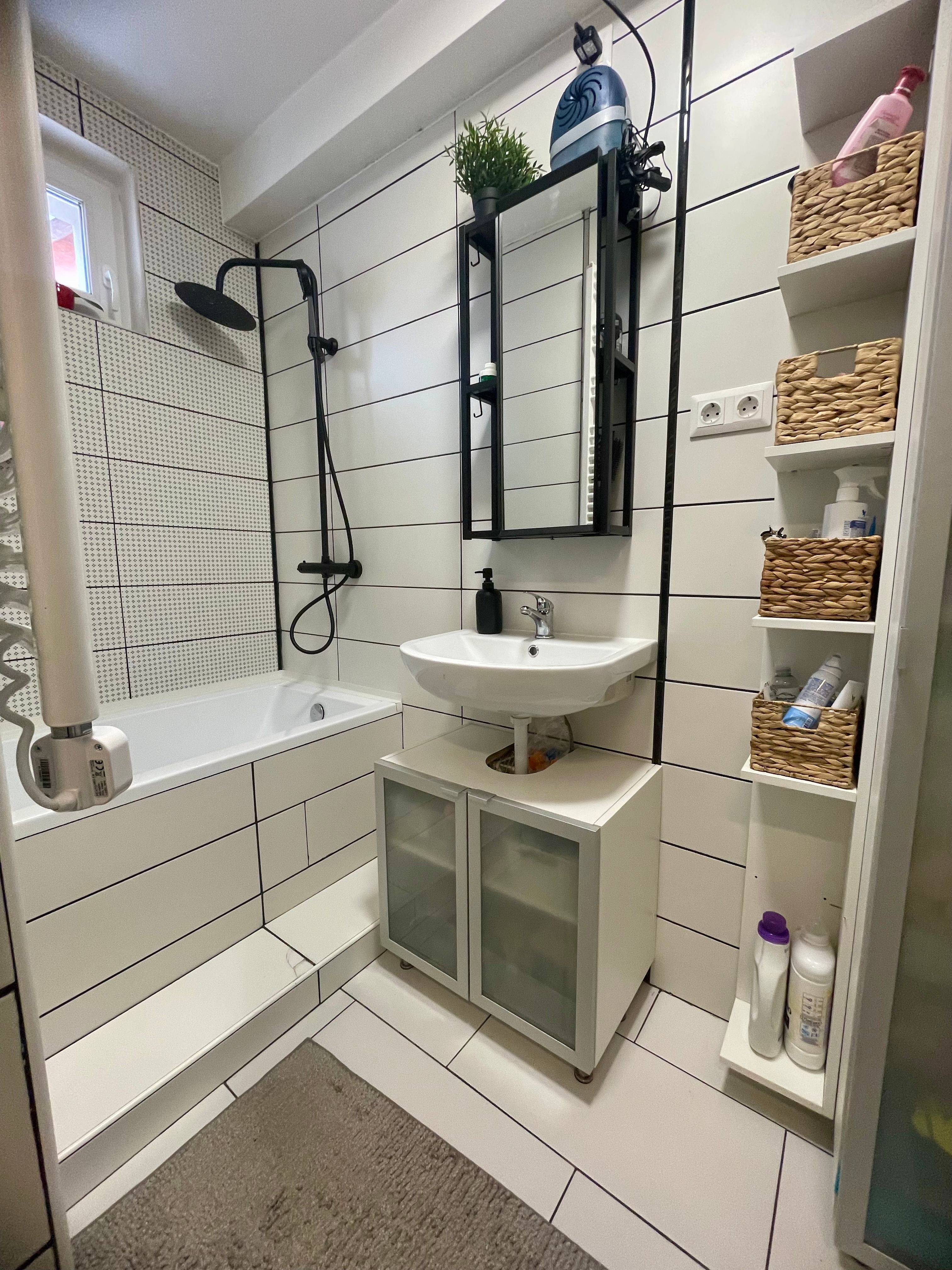 Innen nyílik a tolóajtós fürdőszoba, amely szintén teljes felújításon esett át. Korábban két külön helyiség volt, ám egybenyitásra kerültek. Területe 3.6 m2, elhelyezésre került egy 120-as kád is. Ablak itt is van, így a természetes fény és a szellőztetés itt is megoldott.